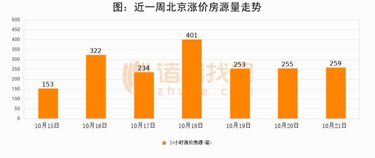 根据诸葛找房数据显示,北京24小时涨价房源量为259套,较10月20日增加4套,环比上涨1.6%。与此同时,涨价房源占比小幅扩大,业主信心有所提升。