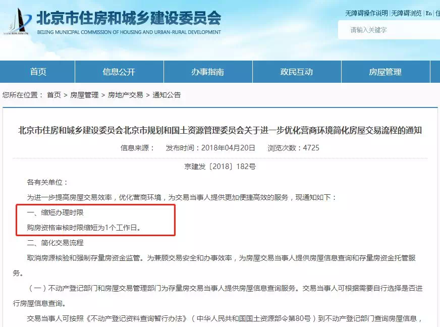 紧随其后,上周五(20日)北京市住建委发布《关于进一步优化营商环境简化房屋交易流程的通知》称,北京大幅压缩购房资格审核时限,由过去的5个工作日缩短为1个工作日,并取消房源核验和强制存量房资金监管。