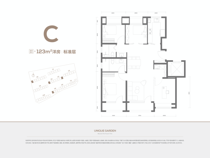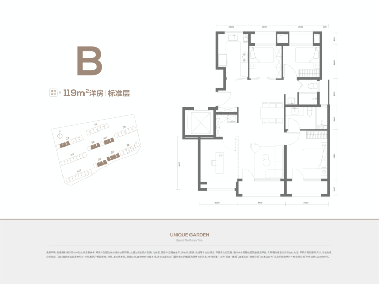 123平四居两卫,南北通透,三面朝南;格局和119平类似,不过北向两个卧室面宽会比119平的大些。