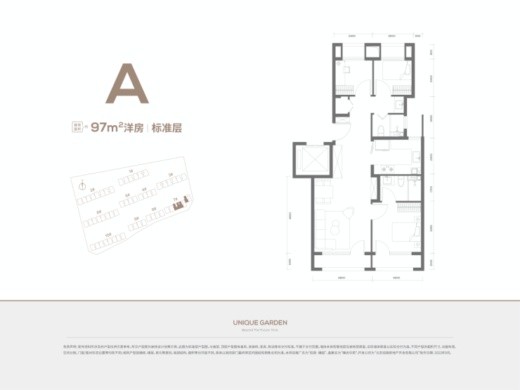 97平三居两卫,中间户标准层,南向配置两个阳台,主卧套房设计,主卫干湿分离,相比其他户型来说,这个整体偏长。