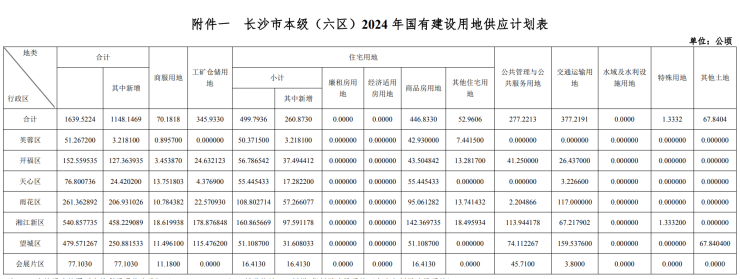 长沙市本级行政辖区(包括芙蓉区、开福区、雨花区、天心区、湘江新区、望城区、会展片区)2024年国有建设用地供应总量控制在1639.52公顷以内,其中新增建设用地控制在1148.15公顷以内,鼓励和引导利用存量建设用地491.37公顷。