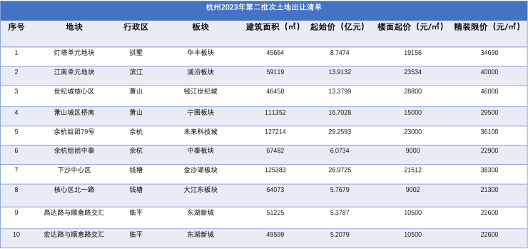 距离上一场土地出让结束才一周时间,2月27日,杭州又公布了今年第二批次土地出让清单,挂牌的10宗宅地总出让面积74.76万平方米(465亩),起始金额131.4亿元,计划于3月29日出让。