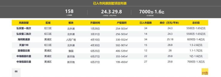 据统计,上半年已经入市158套风貌别墅项目,入市均价24.3万-29.8万元/平方米,主力总价段为7000万-1.6亿元。这些项目分别是弘安里一批次、弘安里二批次、海玥黄浦源、天潼198、露香园云宸、中海顺昌玖里、中海恒昌玖里等。