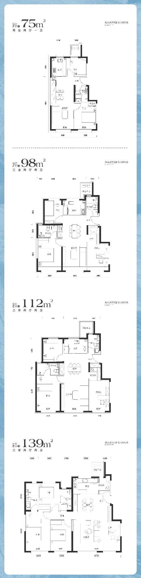 产品主要有5个面积段,分别为62㎡,75㎡两居、98㎡和112㎡的三居,还有115㎡和139㎡的四居,平均得房率在84%左右。