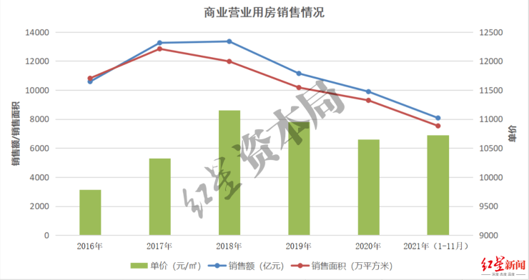 近几年,互联网兴起,实体商业遭受冲击。红星资本局整理统计局数据发现,我国商业营业用房连续3年出现价量齐跌;叠加疫情的影响,商铺单价也有所起伏,但起伏并不算太大,2021年已有所回升。
