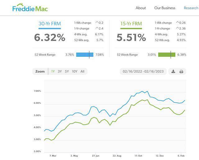 据房地美(Freddie Mac)的数据,30年期抵押贷款平均利率于去年10月和11月两次突破7%,此后稳步回落,截至16日,抵押贷款利率已降至6.32%。