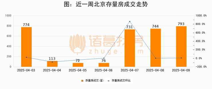 从存量房来看,2025年04月09日北京存量房单日成交793套,比昨日增加49套,环比上涨6.6%。从近一周存量房成交来看,北京存量房日均成交套数为471套,04月09日单日成交793套,高于近一周平均水平68.4%。