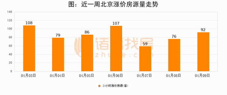 根据诸葛找房数据显示,北京24小时涨价房源量为92套,较04月08日增加16套,环比上涨21.1%。与此同时,涨价房源占比小幅扩大,业主信心有所提升。