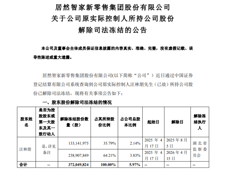 4 月16日晚间,居然智家新零售集团股份有限公司(000785.SZ)发布公告,宣布公司原实际控制人汪林朋所持全部股份已完成司法冻结解除,合计3.72亿股,占公司总股本的5.97%。本次解除冻结系因汪林朋先生逝世后,其配偶杨芳女士通过夫妻共同财产分割及遗产继承完成权益归属调整,相关股份过户及权属变更手续持续推进。