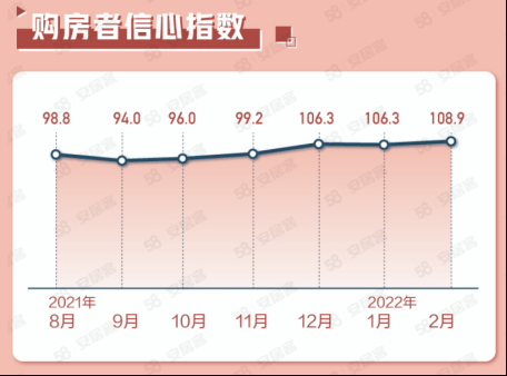 2022年2月,用户信心指数为108.9,环比1月上涨2.4%,61.5%的购房者认为2022年楼市调控政策的走向将继续保持稳定。