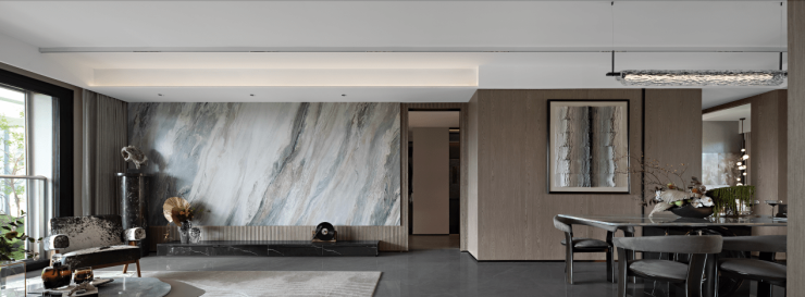 如客厅地面采用如同白玉般的石材,质感细腻;电视景墙使用整块岩板,纹理飘逸,如水墨浸润的抽象画;主卧悬浮吊顶以留白手法,凸显私密惬意;厨房不同色系的柜体搭配,更显高级。