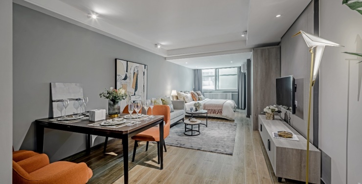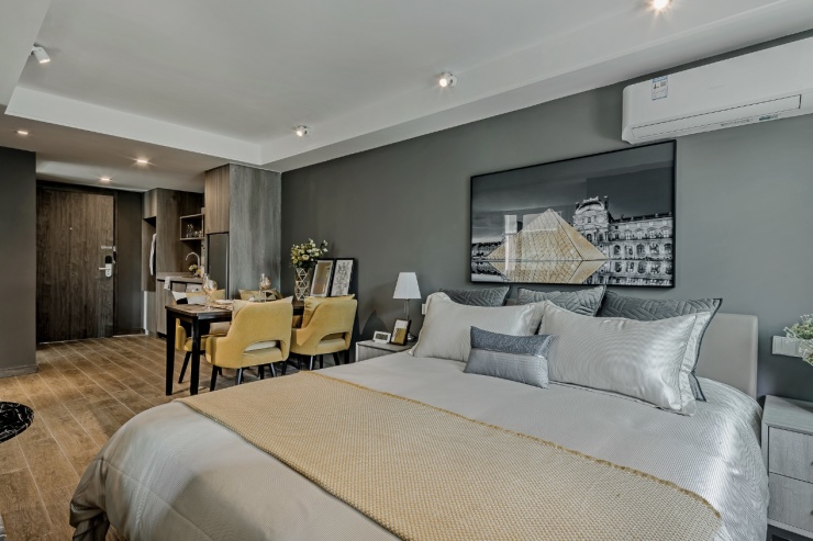 房型设计上均为小户型开间设计,房间内餐区、活动区、睡眠区动线规划合理。卫生间干湿分离。考虑到居住的收纳需求,房间内电视柜、衣柜、台盆柜、鞋柜及置物柜、床头收纳层板等多种储物置物空间,方便客户使用;部分房型还配有步入式衣帽间,储物更独立从容。灰色乳胶漆墙面,木纹地砖,搭配布艺背景墙和布艺沙发,简约中增加温馨感。