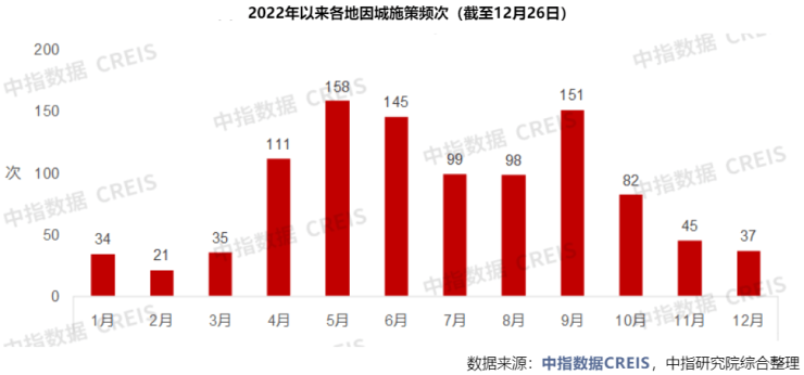 中指研究院认为,2022年因城施策频次创历史新高,未来核心一二线城市政策空间有望释放今年以来,中央多次提出“因城施策”“一城一策”用好政策工具箱,给予各地较高的调控自由度,地方政府结合当地市场变化及时调整政策节奏,力促市场预期稳定。
