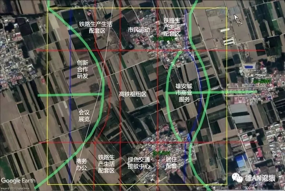 这是聪明的网友千年雄安绘制的雄安站片区的位置和局部功能图(图中黄色是1.6平方公里核心区,蓝色是1.05平方公里2020年建成区,红色线是主要交通干道,绿色是绿地,白色细线是乡镇分界线。)。(在此对雄安新区吧友千年雄安表示敬意和致谢。)