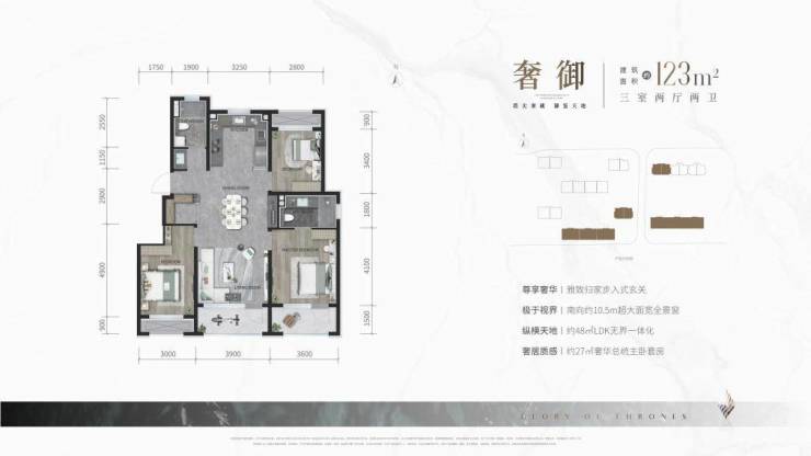 约123㎡户型,除了超90%得房率,还拥有区域惟一三面宽全景落地窗,舒适度加倍升级。