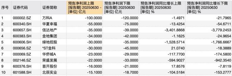 此外,信达地产、绿地控股、金科股份、华侨城、荣盛发展、首开股份和东辰实业的上半年预计亏损额上限亦进入前十。