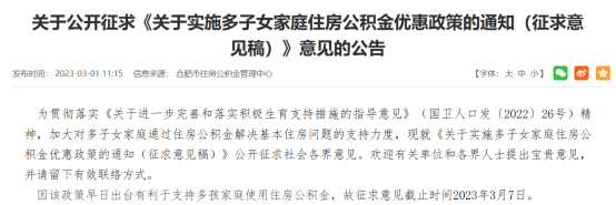 3月1日,合肥住房公积金管理中心发布《关于实施多子女家庭住房公积金优惠政策的通知(征求意见稿)》。