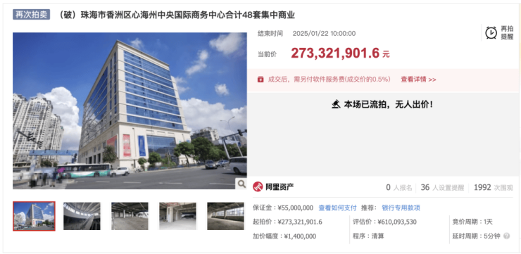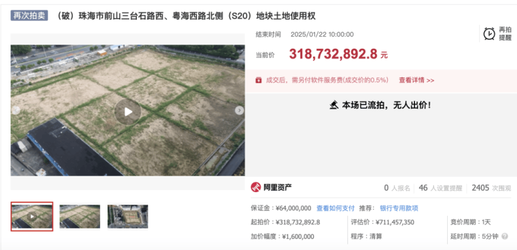 1月23日,据阿里资产拍卖网披露的信息,广东省珠海市前山三台石路西、粤海西路北侧(S20)地块土地使用权三次拍卖再遭流拍,第三次起拍价约3.18亿元,较前一次起拍价下降了约1.79亿元,资产评估价约7.11亿元。该地块为心海州项目综合地块。