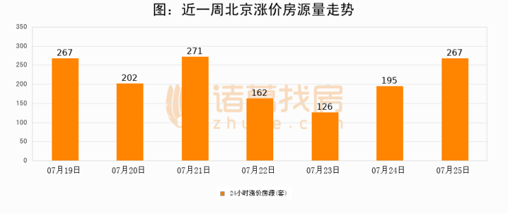 根据诸葛找房数据显示,北京24小时涨价房源量为267套,较07月24日增加72套,环比上涨36.9%。与此同时,涨价房源占比小幅扩大,业主信心有所提升。