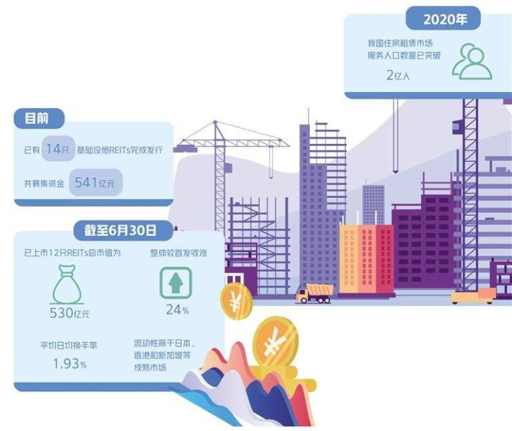 目前,我国REITs试点工作推进顺利,市场初具规模。截至目前,已有14只基础设施REITs完成发行,共募集资金541亿元;截至6月30日,已上市12只REITs总市值为530亿元,整体较排名前列收涨24%;平均日均换手率1.93%,流动性高于日本和新加坡等成熟市场。