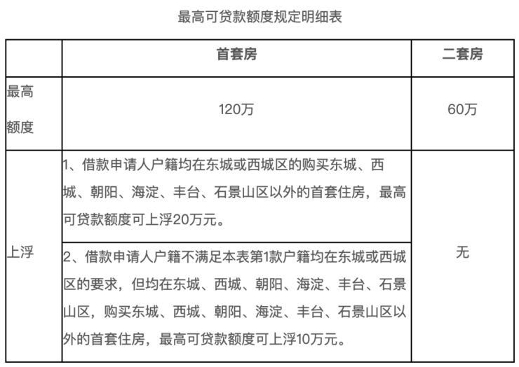 目前北京的政策是,公积金首套房贷最高额度为120万元,如果是东、西城家庭,购买城六区之外的首套住房,贷款最高额度还可以上浮20万元,也就是140万元;如果是城六区家庭,购买城六区之外的首套住房,贷款最高额度可以上浮10万元,也就是130万元。
