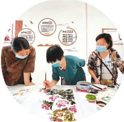 河南省汝阳县城关镇退休教师马兰芳(中)在杜康社区教居民画画。