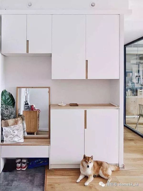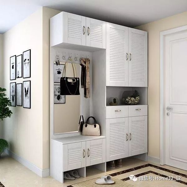 百叶柜门,柜子中间可以随手放些小东西,挂钩节省空间,照一下镜子,出门。