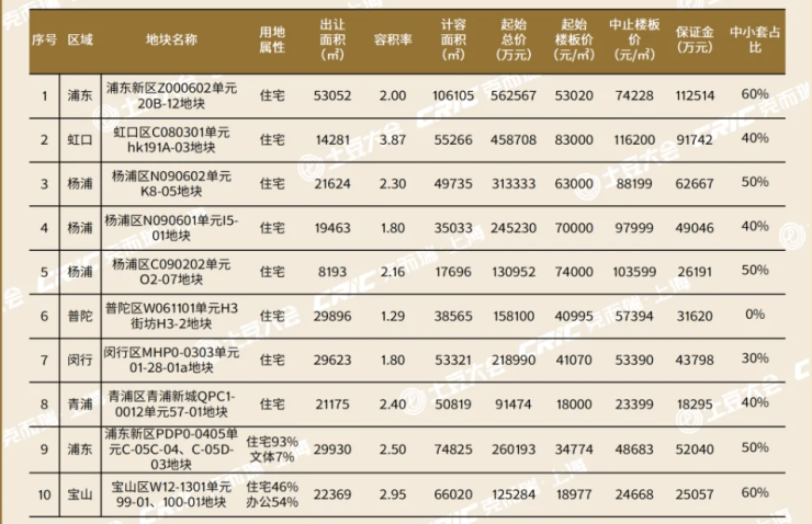 起始总价最高的为浦东新区Z000602单元20B-12地块,为56.2567亿元。该地块规划为普通商品房;位于三林镇,东至思恬路,南至20B-11地块,西至20B-11地块,北至杨新东路;出让面积53052.36平方米,容积率2.0,计容面积106104.72平方米。