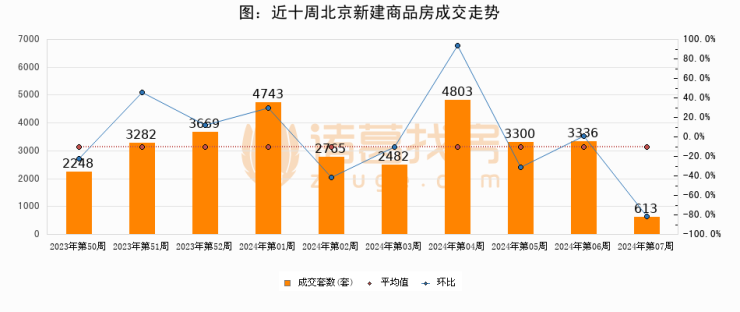 进入2024年第06周(02月05日-02月11日),北京新建商品房成交613套,较上周减少2723套,环比下降81.6%。从近十周成交来看,周均成交套数为3124套,本周成交613套,低于近十周平均成交量80.4%。
