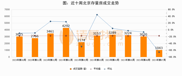存量房方面,第06周北京存量房成交1043套,较上周减少1977套,环比下降65.5%。从近十周成交走势来看,周均成交套数为2944套,本周低于平均水平64.6%。