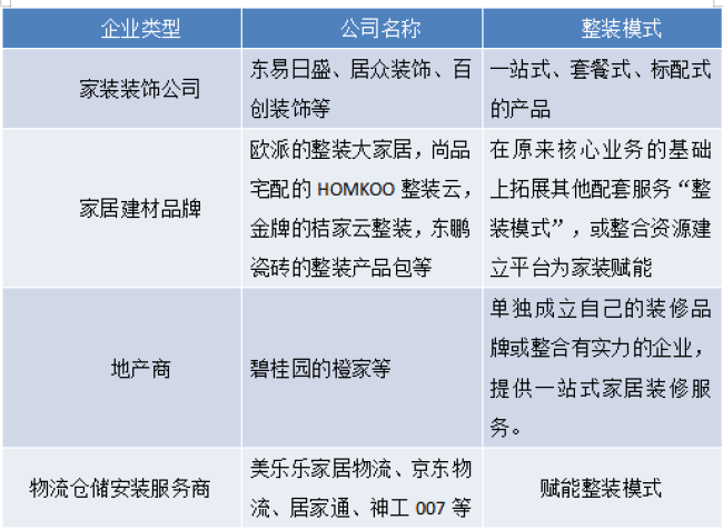 据悉,目前市面上的整装玩家可以分为房地产商、家装公司,家居建材品牌、还有一些物流仓储安装服务商。这些玩家的玩法大同小异,都在整合材料、产品、施工、软装、设计等完善产业链,向B端或者C端提供服务。他们或选择为家装公司赋能,或直接为消费者提供集设计、软装、硬装、材料、施工一站式拎包入住服务。