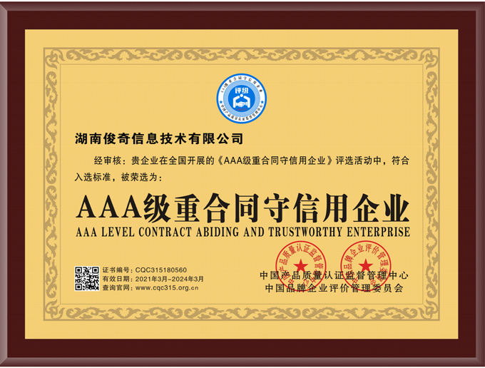 近日,湖南俊奇信息技术有限公司喜获由中国产品质量认证监督管理中心、中国品牌企业评价管理委员会颁发的“中国3.15诚信品牌企业”、“AAA级重合同守信用企业”两项荣誉。