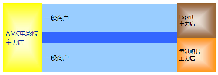 案例:又一城的AMC电影院颁布在三层、海港城的”连卡佛“分布在三个层面、太古广场的”生活创库“分布在四个层面,而SEIBU分布在两个层面、荃湾广场的”吉之岛“分布在四个层面,玛莎百货几个在每个购物中心都有两个以上的层面。