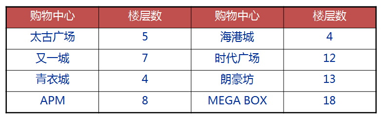 香港购物中心都是多层,较高有18层之多,通过多主力店的设置,使购物中心的人流拉动力达到较强。香港有的购物中心一层有数个主力店,如又一城、海港城等购物中心,某些层级一层甚至于有三家以上的主力店。