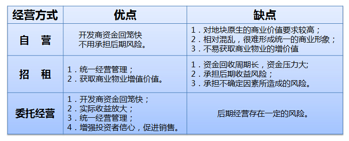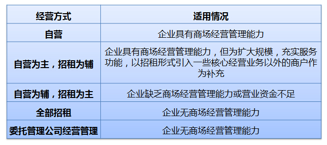 根据企业实力、经营目标、承受风险能力等因素考虑采用哪种经营方式,按实际情况,一般可以采用自营、招租、委托经营管理三种主流方式。