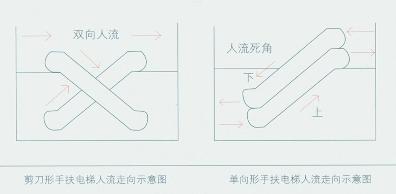为有效地组织人流垂直流动,购物中心通常设置了大量的自动扶梯,多达几十部上百部,有的大型购物中心甚至达几百部。自动扶梯成为购物中心组织人流垂直流动的主要的、也是较重要的设施。