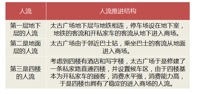 香港具有复合型人流推进结构的购物中心比较有典型意义的是太古广场。从人流推进结构来说,太古广场拥有三个层面的人流推进系统,同时对多个楼层直接导入客流,地铁口直接与较高楼层相连,使各楼层感觉像都在地面,从而提高了各楼层租金的收益水平。