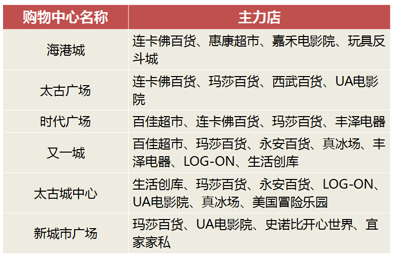 3、主力商家重复度高,但购物中心善于利用自身特色形成优势。