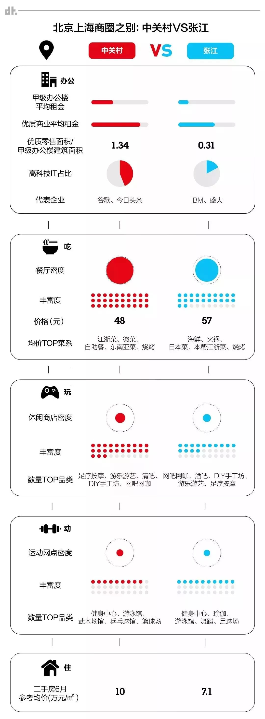 结果是中关村要在租金方面超过张江,近3K的房价差显示出了中关村少有的地位。在娱乐方面,二者不相上下,尽管长泰广场的开业甚至为张江带来了酒吧街,但中关村的发展更早,各项数据都不落下风。
