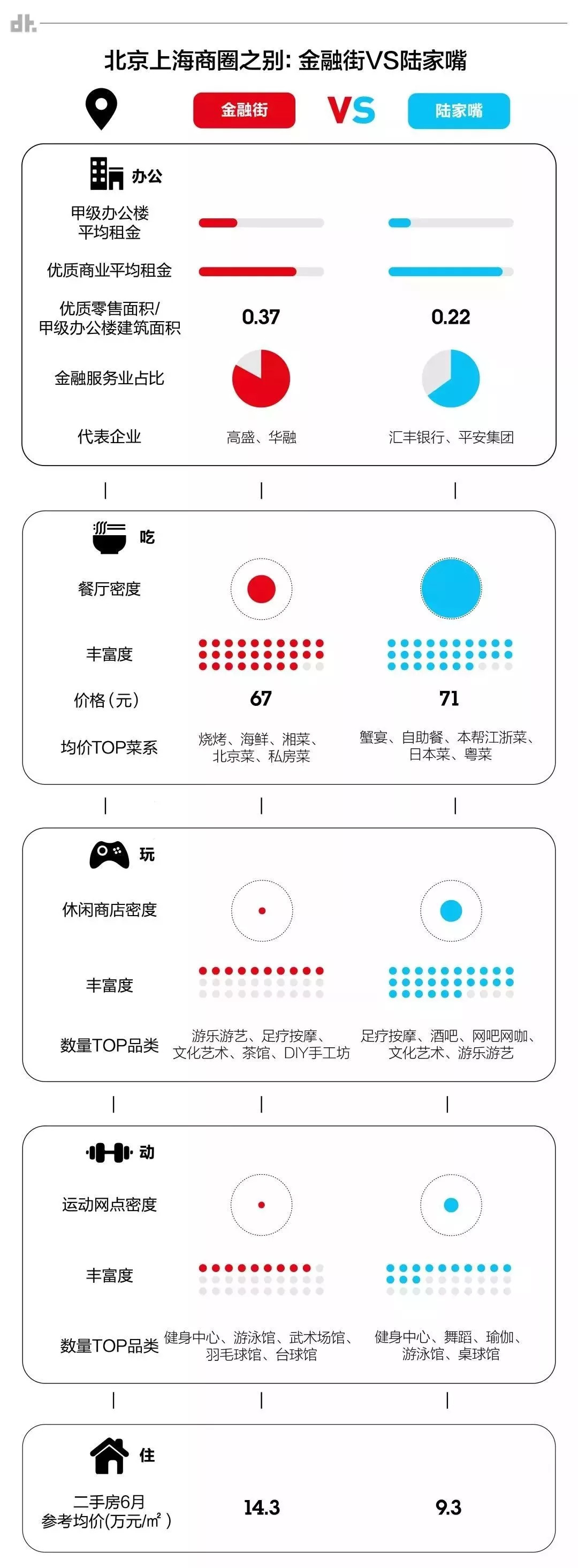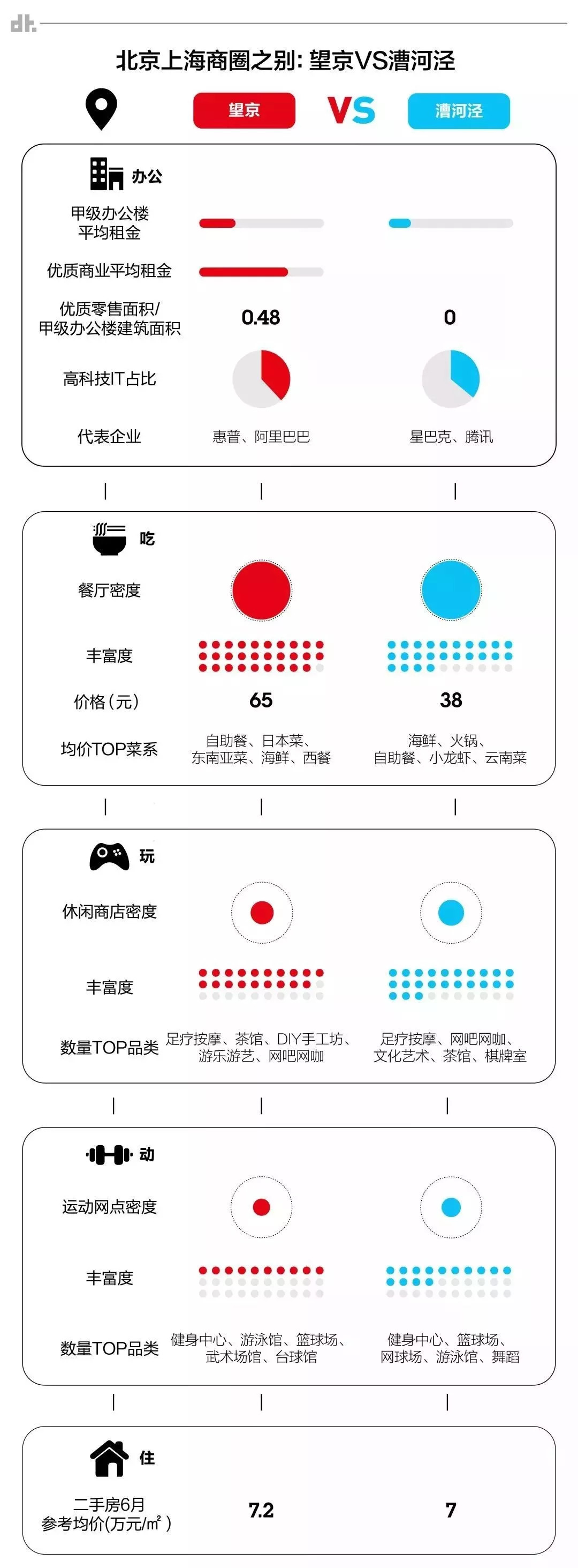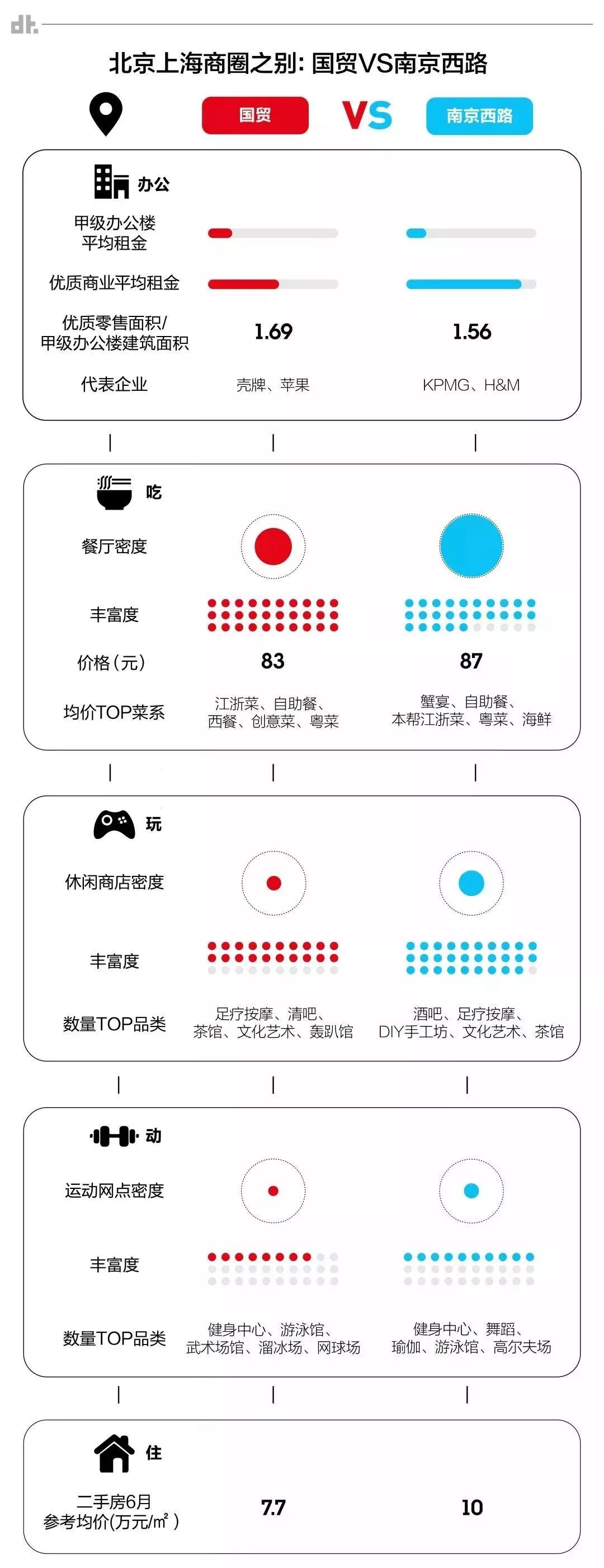不过也有差异之处,例如国贸的平均工资比南京西路高了一些,二手房均价却便宜不少。在吃、玩、运动这三个板块中,国贸都略逊南京西路一筹。