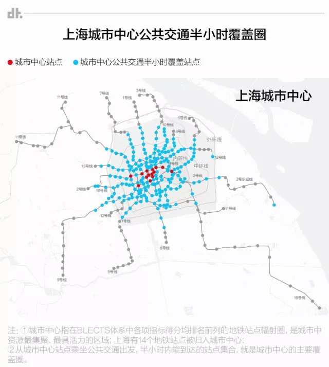 从交通覆盖图上来看,各个中心的辐射范围也是基本一致。例如南京东路站与徐家汇站的辐射范围有近半重合,它们都跨越了几条环线。