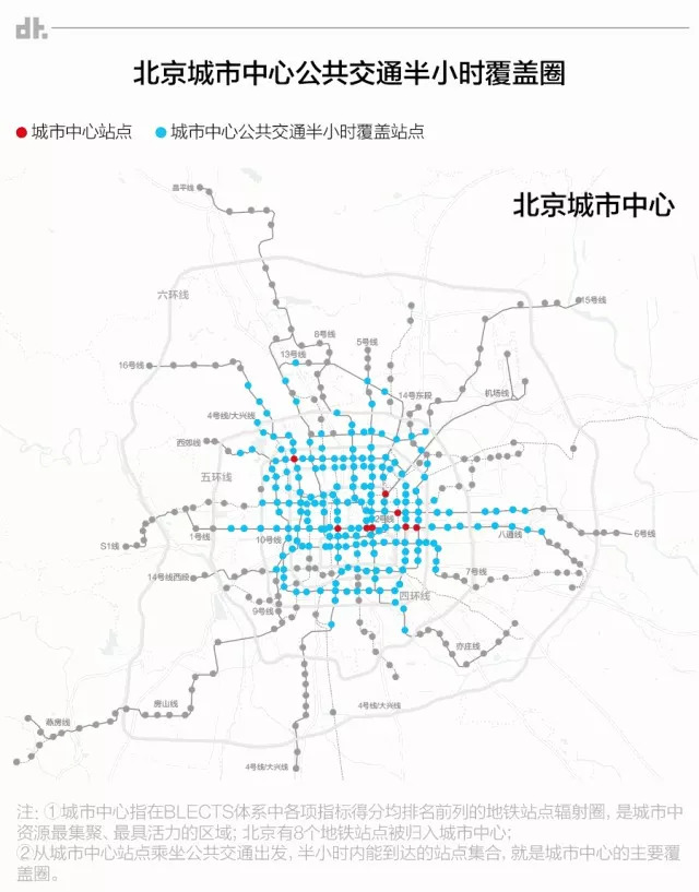 我们还可以看看北京8个城市中心站点的公共交通半小时覆盖圈。
