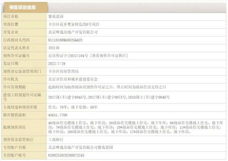 7月29日,北京市住建委官网公布,葛洲坝北京中国府(紫苑嘉园)项目获得预售许可证,准许销售面积45651.77㎡,获批部分为4号楼-7号楼、10号楼、11号楼、16号楼和17号楼的地上住宅和地下仓储。