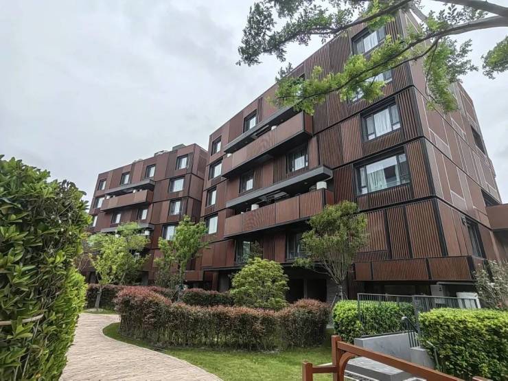 公开信息显示,“沁风雅苑”一共由18栋6层的叠加组成,整体呈倾斜镜像状排列,外立面采用木色调,风格极为独特。
