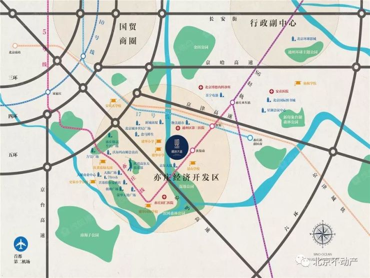 交通:紧邻五环,京津、京沪双高速;亦庄线、17号线、S6轻轨、T1有轨电车紧密围合