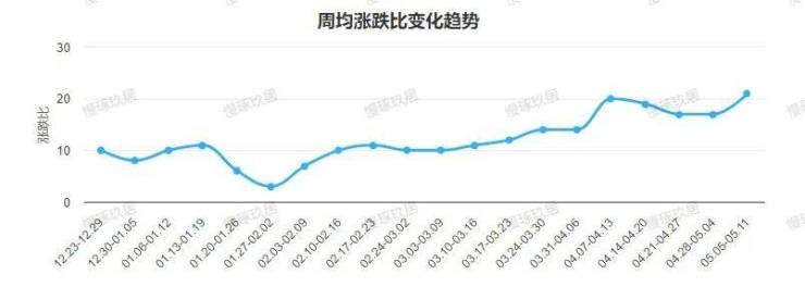 但是新政之后,数据观察到,涨跌比有上涨的趋势,上一周的涨跌比的平均值超过了“20”这个阈值。