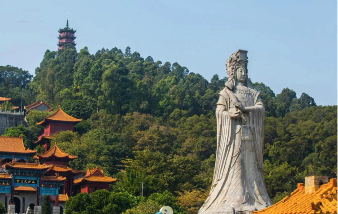 南沙天后宫,前身是明代南沙鹿颈村天妃庙,经重修定名为“元君古庙”。天后宫紧临珠江出海口伶仃洋,坐落于大角山东南麓,在天后广场正中就是石雕天后圣像(高达 14.5米),是为纪念海上女神林默而建,其规模是现今世界同类建筑之较,被誉为“天下天后排名前列宫”,也是东南亚较大的妈祖庙。