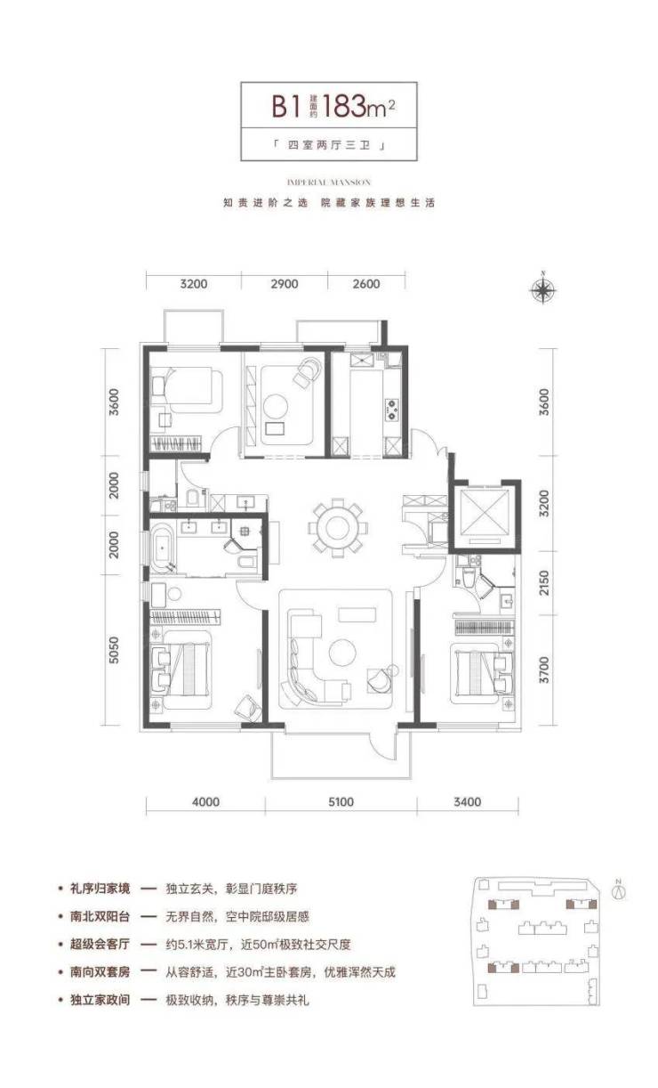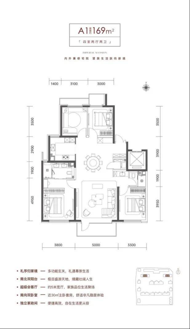 建面约169平米四居,同样南北双阳台,客厅面宽5米,主卧套房面宽3.8米,整体近30平空间,主卫升双台盆配置;次卧面宽3.3米,临近客卫同样拥有套房的便捷度;北向两次卧挨着根据不同需求可以打通灵活设计。