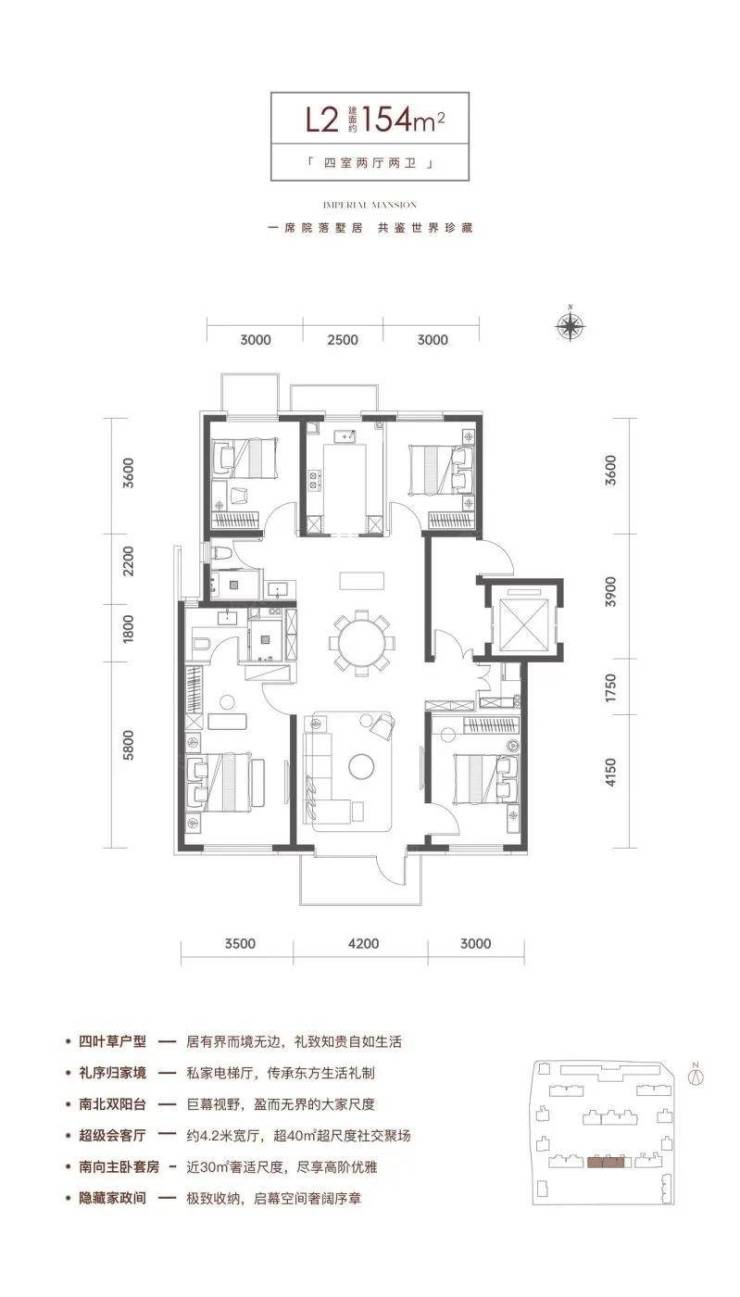 建面约154平米四居,私家电梯厅+玄关,南北双阳台,四叶草格局,每个卧室面宽都在3米以上,多口之家起步首选。