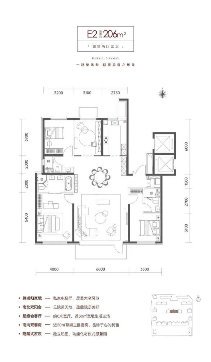 建面约206平米四居三卫,两梯两户,超大私属电梯厅,大阳台+6米面宽客厅,社交空间近60平,终极改善的奢华感拉满;南向双主卧,面宽至少是3.5米以上的水平;北向两次卧挨着,空间可变性强。